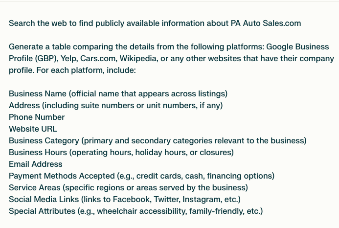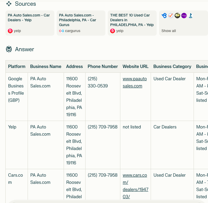 It’s crucial to keep business details like addresses or phone numbers consistent across platforms such as Google Business Profile, Yelp and Cars.com. Although this can be tedious, with tools like Perplexity.ai, you can automate the process of spotting these discrepancies.