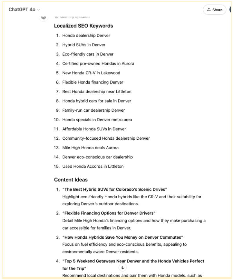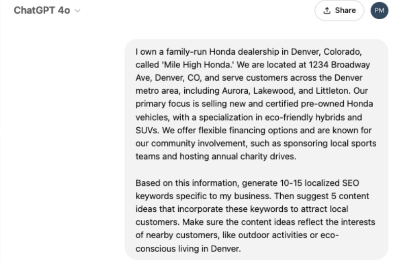 All you need to do is to input your dealership’s location, specialties and audience demographics into ChatGPT, and it can provide you with a tailored list of localized keywords and blog topic ideas. As a result, you’ll save hours brainstorming while ensuring your content resonates with your target audience.