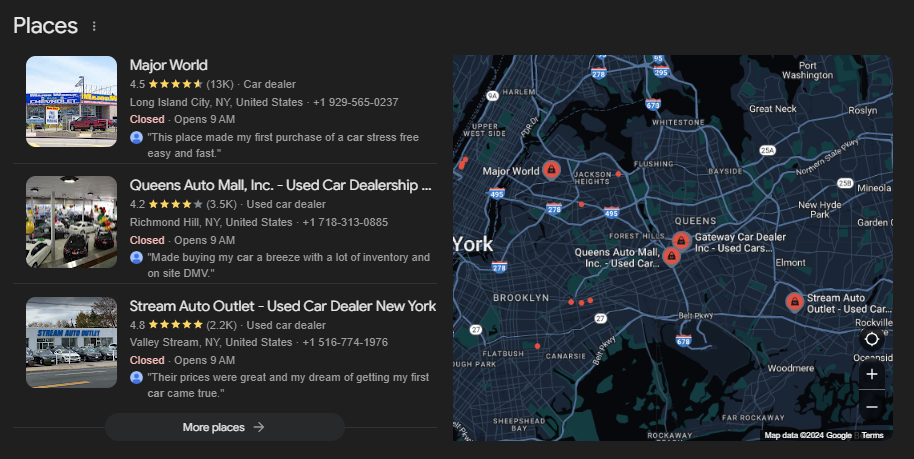 Below is an example of what shows up when you search for “car dealership in New York.”