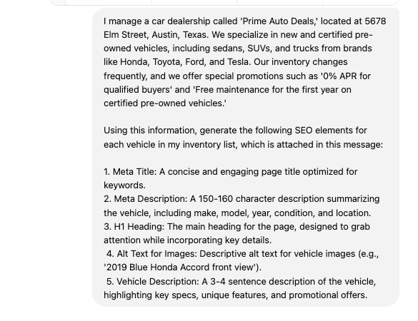 Keeping your dealership’s inventory pages optimized doesn’t have to be a headache. AI tools like ChatGPT make it easy to stay on top of updates as vehicles come and go.