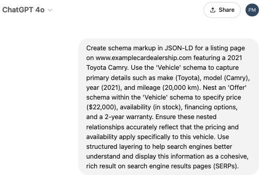 Below, you can see how a detailed prompt can be used to create schema markup: