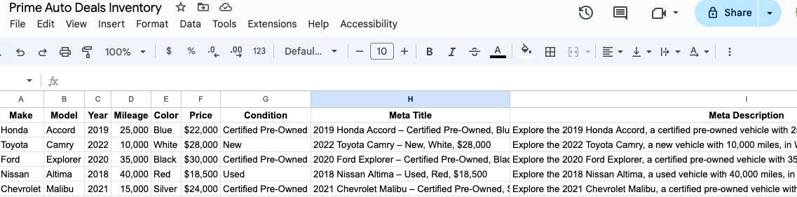 As cars roll off the lot and new ones arrive, the AI ensures your metadata stays up-to-date, helping your pages rank higher in search results without endless manual tweaks.
