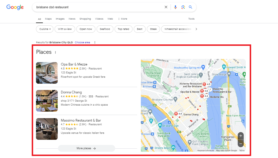 Let’s say that you’re a restaurant owner trying to make a mark in the Brisbane market. You’ll want to target all of the basic local keywords, like “Brisbane restaurant.”