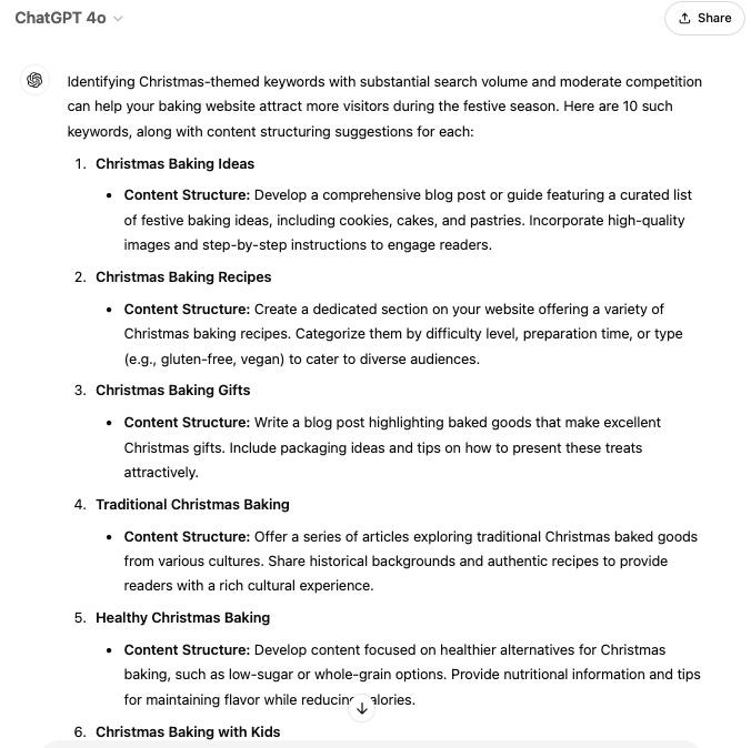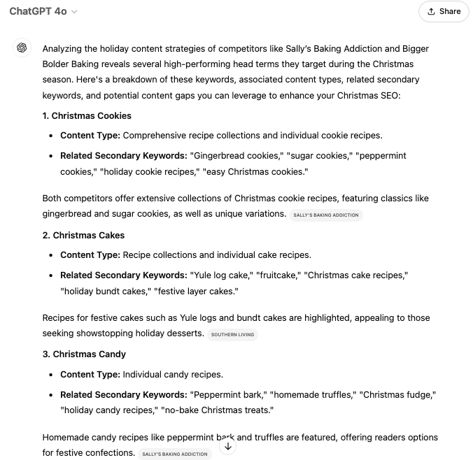 ChatGPT offers a fast and easy way to learn what your competitors are doing and use those insights to dominate the holiday season. If you want to know their best-performing keywords or content strategies, just feed ChatGPT a prompt like this:
