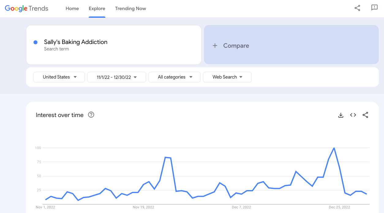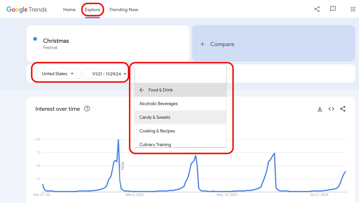 Once you have those suggestions, use Google Trends to verify their popularity. You’ll want to look for keywords that have steady interest or a clear holiday spike.