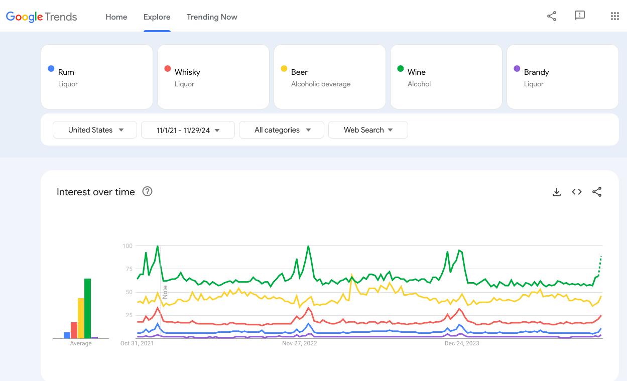 For example, the terms Wine and Beer might dominate the search charts compared to other beverages, especially during Christmas. Using these insights, you can determine where to focus your energy to meet seasonal demand.
