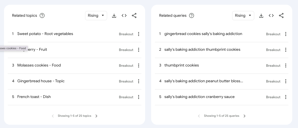For example, let’s say you run a baking website. Searching for a competitor like “Sally’s Baking Addiction” might reveal that people are searching for related terms like “gingerbread cookies” or “thumbprint cookies.”
