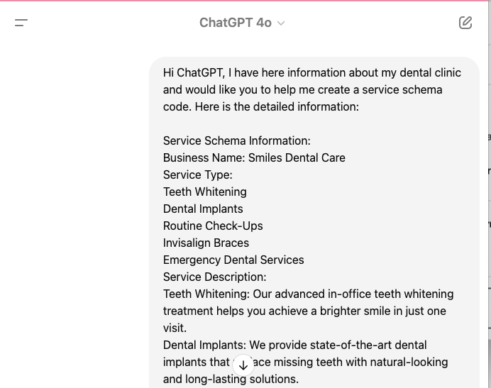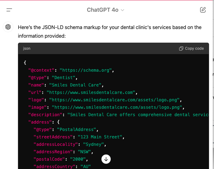 For example, using ChatGPT for schema markup is a great idea. Here, you can generate the necessary schema code just by providing ChatGPT with your clinic’s information.
