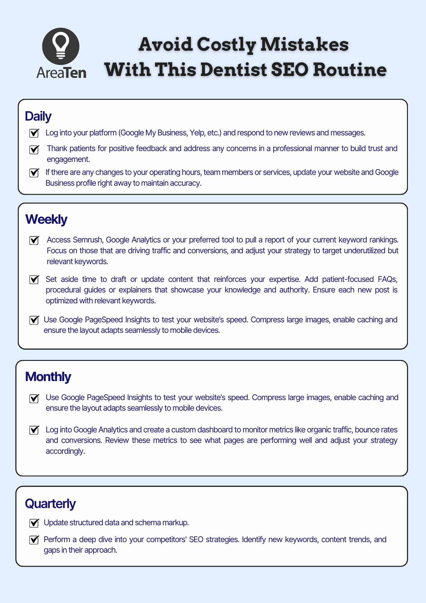 Just like how a good dental routine keeps your patients from facing expensive problems, sticking to a solid SEO routine can keep your website in great shape and ahead of the competition. That’s why we’ve put together this handy guide to help you dodge common SEO slip-ups and keep those rankings strong.
