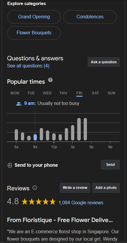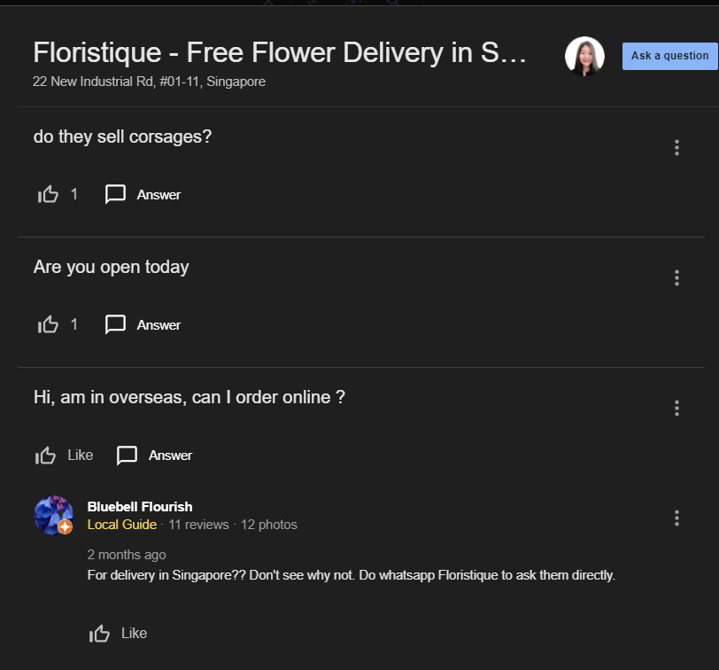 But if you fully optimize your GBP, you can guide people straight to the exact services or products they’re looking for—whether that’s bouquets or delivery options. Plus, the Q&A feature is a goldmine for connecting with potential customers, answering their questions, and building trust.