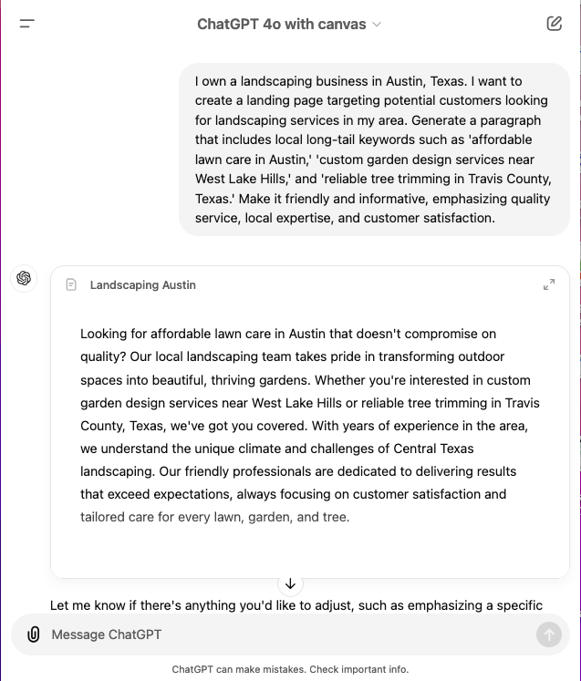 For instance, if your landscaping business operates in Austin, Texas, you’d want to zero in on keywords like “Austin landscaping services” or “lawn care near South Congress Avenue.” Phrasing variations such as “best landscaping in Austin” or “affordable lawn care near South Congress” also help capture local customers actively searching for services close by.