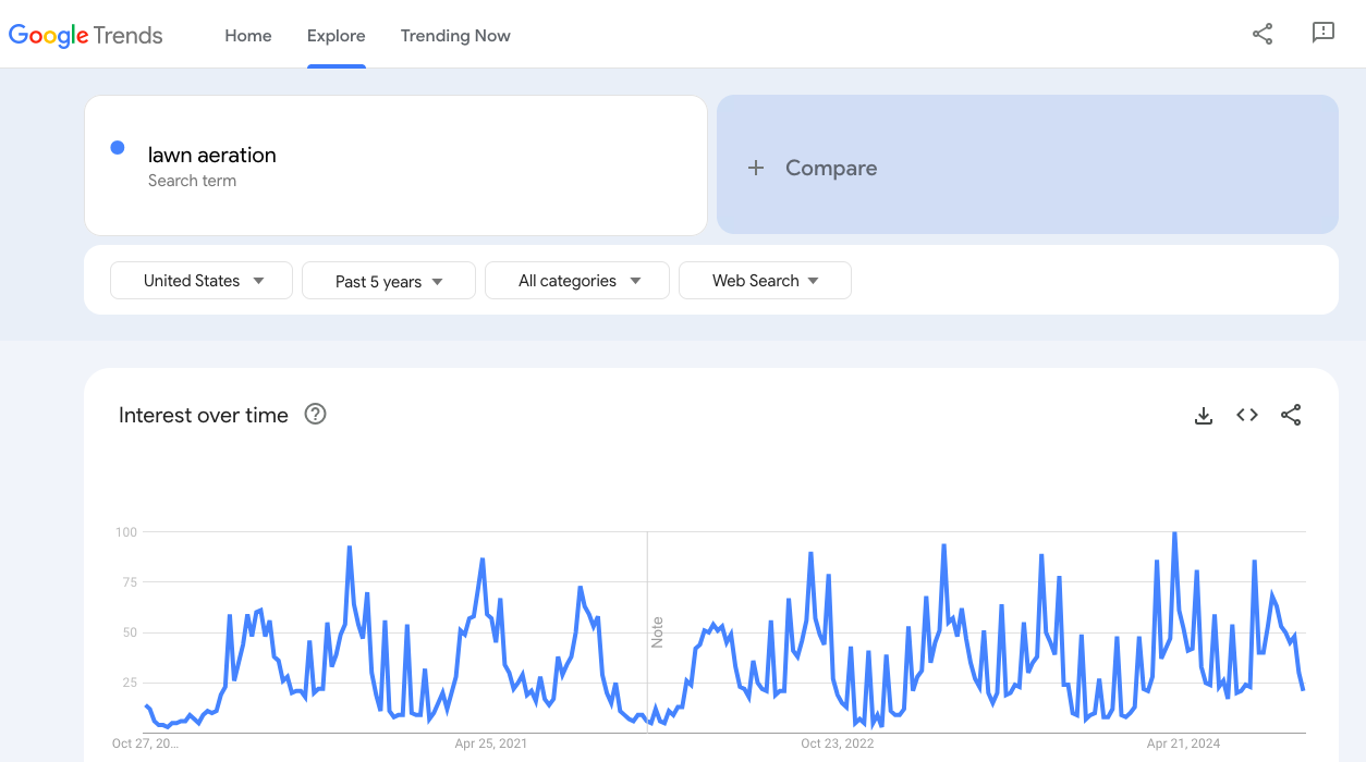 For instance, if you’re in landscaping, consider using Google Trends to track seasonal search patterns like “lawn aeration” in early the fall or “snow removal services” in the winter. This data can guide you in developing a content calendar aligned with peak search periods for your services, giving you a continuous edge in visibility and customer reach, year-round.