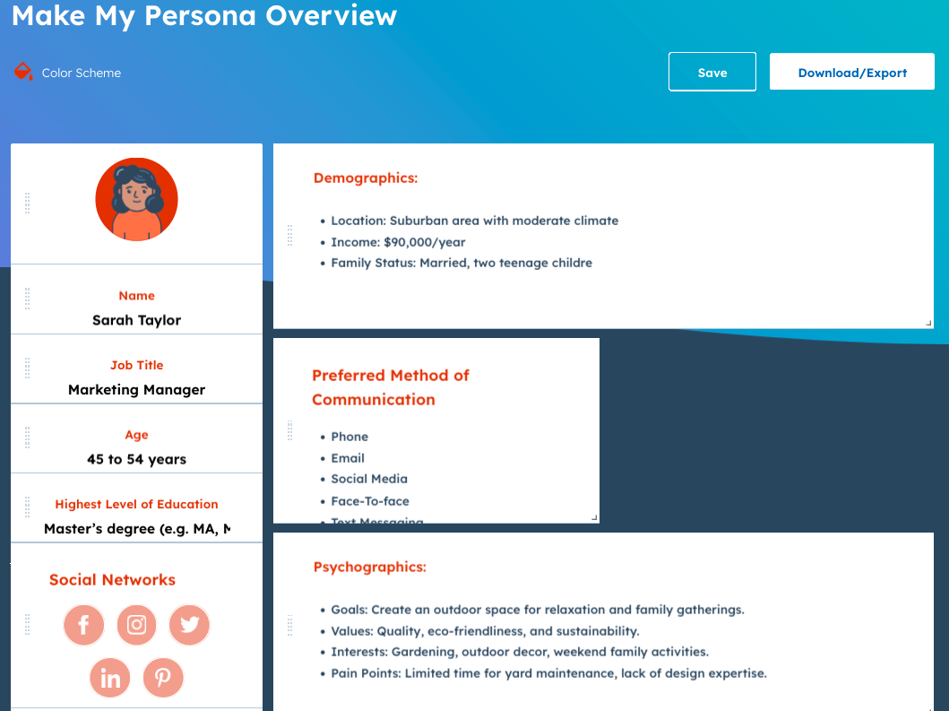 | HubSpot’s AI Personas Tool | Creates detailed buyer personas based on demographics, pain points, and motivations. | Develop personas tailored to landscaping customer segments for targeted content. |