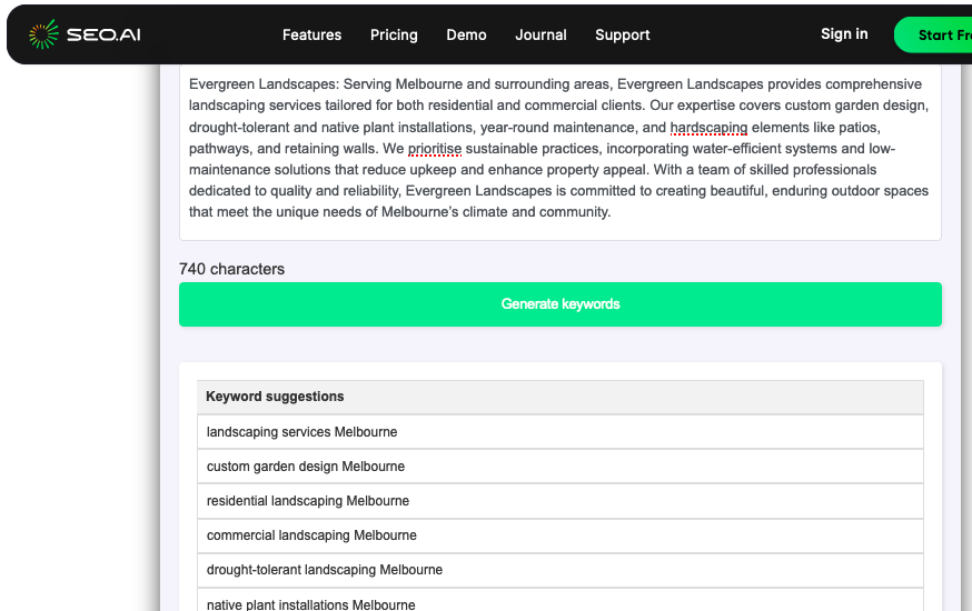 Just type a quick description of your services and click “Generate keywords.” SEO.AI will then provide you with a curated list of keyword ideas aligned with what customers are actively searching for. It’s a practical, time-saving way to connect your business with the exact terms your potential clients use.