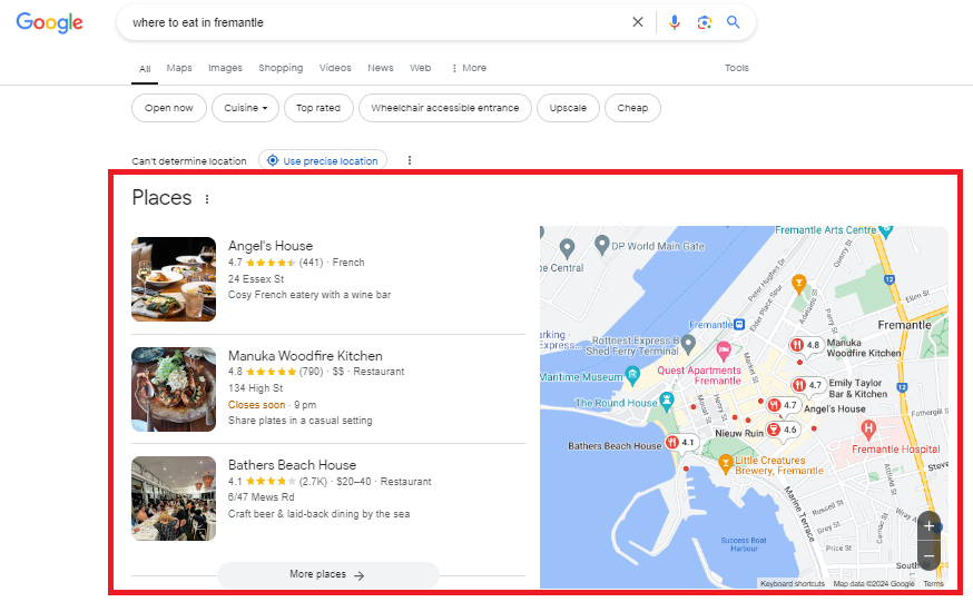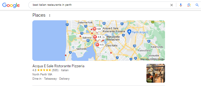 The image below is just an example of how a food establishment can rank for keywords like ‘Best Italian restaurants in Perth’. You can appear in these searches too with an Australian SEO agency that knows which local nuances move the needle.