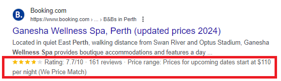 Below is an example of a rich snippet. Notice how it shows a rating for the business right off the bat on the search results page. If searchers see from the get-go that your business has great reviews, then they are much more likely to give it a chance.