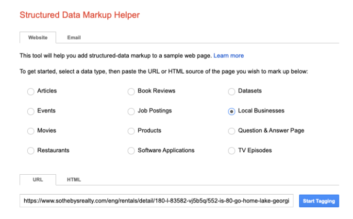 Begin by heading over to the Google Structured Data Markup Helper. Once there. select the type of data to mark up. For rentals, “Product” or “Local Business” works well if “RentalProperty” isn’t an option.