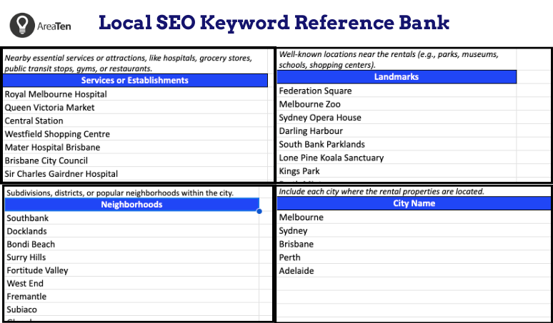 A local SEO keyword reference bank can be your roadmap to attracting hyper-local traffic and maximizing your online presence. To help you create your own reference bank, you can make use of Area Ten’s ready-made template.