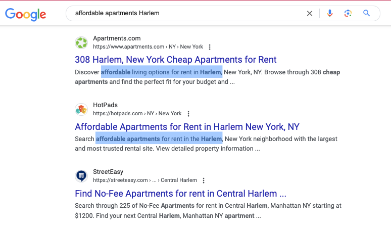 Neighborhood-specific terms like “affordable apartments Harlem” are like breadcrumbs leading searchers straight to your listing.