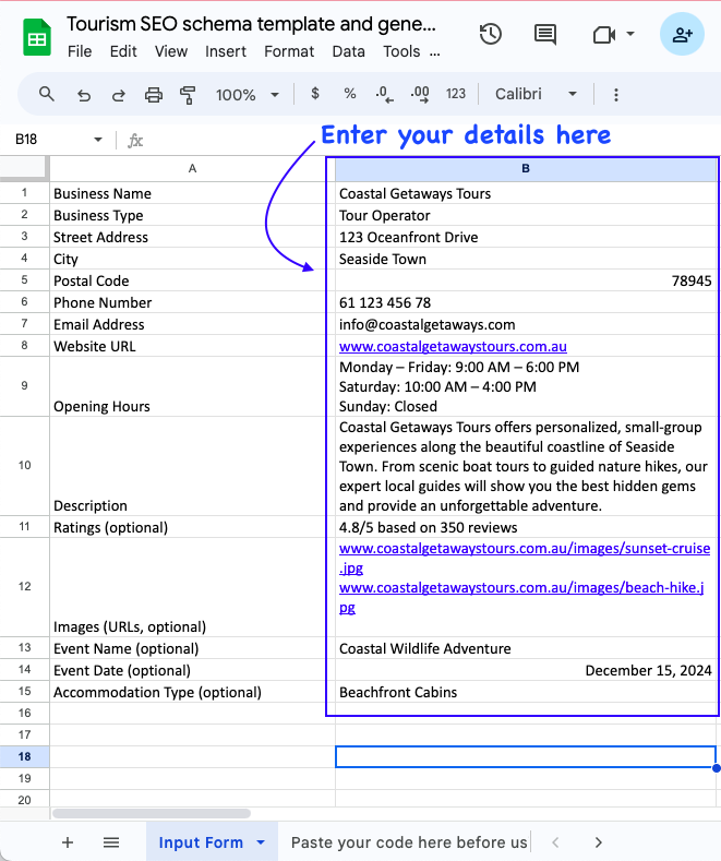 Create a copy of the sheet here, and keep reading below to learn how to use it: Tourism SEO Schema Template and Generator