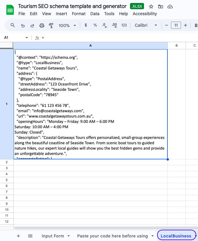 All you need to do is fill out Column B in the Input Form sheet, and like magic, the file will generate the schema markup for you. It’s a quick and easy way to boost your SEO without needing to be a programming expert.