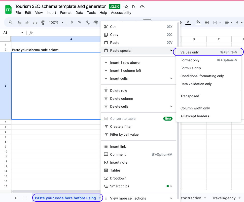 Just a quick heads-up: Before you use your schema, make sure to copy it, right-click, then hover over “Paste Special” and select Paste Values to paste the schema code on this sheet first. If you skip this step, the schema codes won’t work!