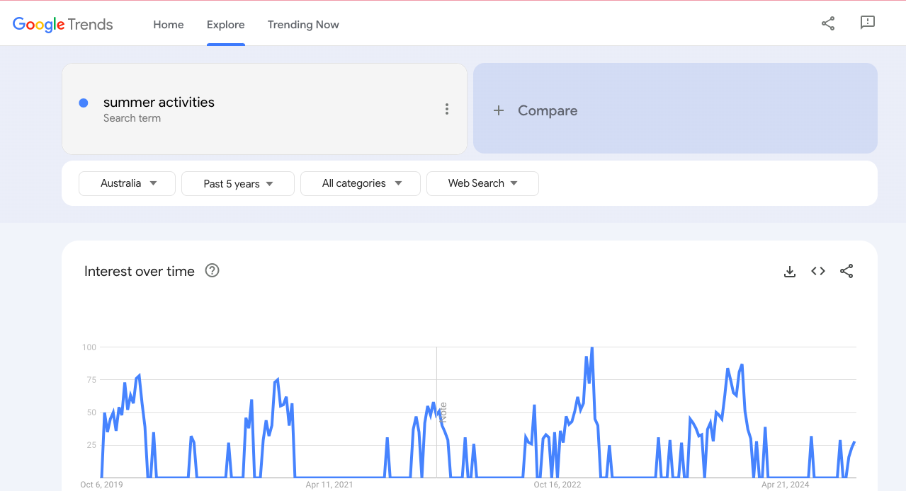 Tools like Google Trends can help you identify when people start searching for these topics, so you can optimize your content before the peak search period hits. For example, searches for “summer activities” tend to spike in Australia during their warmer months. Having this insight means you can update your content and make it more relevant just in time.