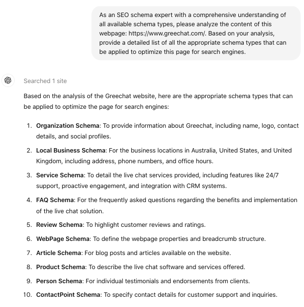 But how do you know what to use among the 34 schema options? Depending on your website, you might benefit more from one type over another, or even by combining multiple types. I understand that it can be tricky to nail down your choices. That’s when ChatGPT can help you—to identify the best schema markup opportunities for your site.