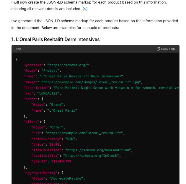 For example, instead of just asking for a product schema, I began including specific product details such as name, brand, model, price, availability, and customer reviews. The resulting schema was far more robust and accurate this time.