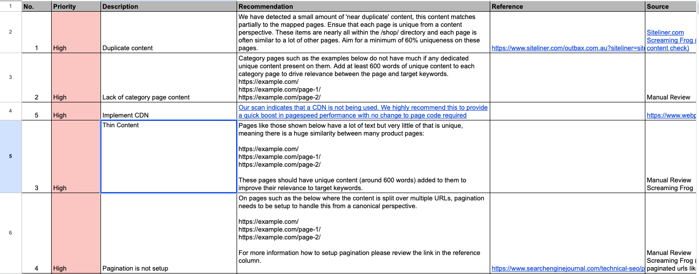 Like what we did above, you can further refine your data by adding columns for recommendation. This helps the team understand the exact problem and the steps needed to resolve it. Including references and sources provides additional context and resources for addressing the issues.