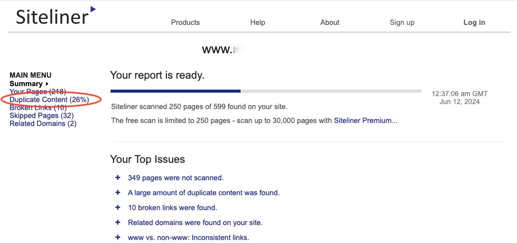 Step 2: Wait for the scan to complete and expand on Duplicate Content.